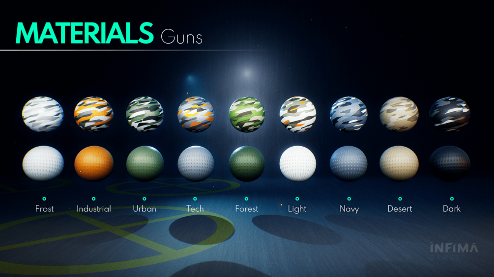 ➡️ 16+ Custom Gun Materials - You’ll find an abundance of different materials to customize your favorite guns including camo variations, patterns, and iron sight glowing dots.