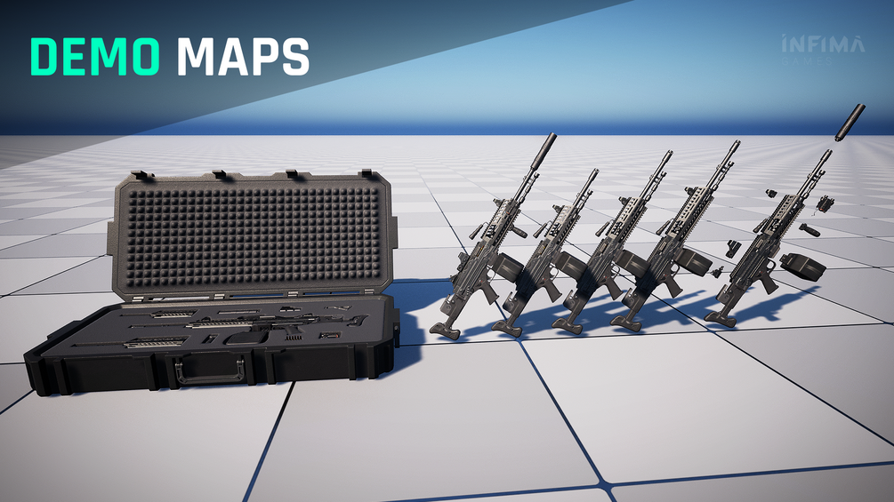 - Example Blueprints – Demonstrating how to set up and use the weapon in-engine using the provided socket setup.